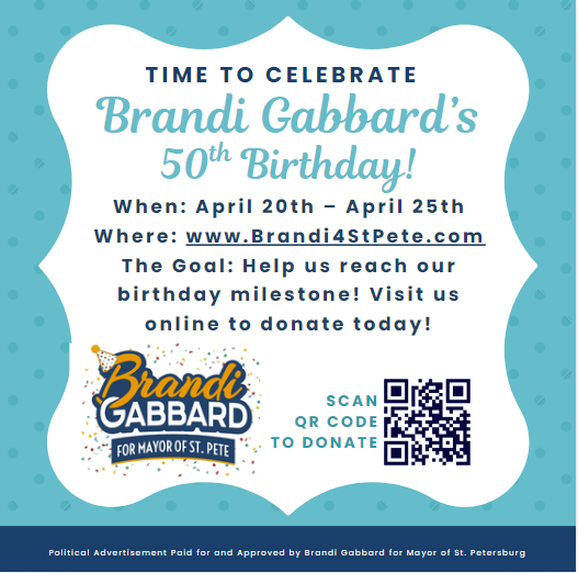 Brandi Gabbard is officially launching her mayoral campaign in Saint Petersburg, focusing on community events, sustainable city redevelopment, faster building permits, and affordable workforce housing.